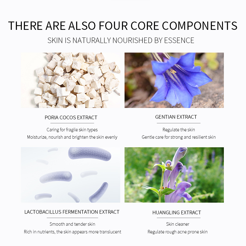 NUCLEAR: Gentiana extract,Purslane extract,Chamomile extract,Poria cocos extract Ling extract,Scutellaria baicalensis extract, Licorice extract,Lactobacillus/Dahua extract Bean fermentation product extract,folic acid,sodium hyaluronate,egg white extract,etc..