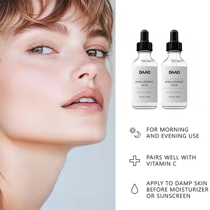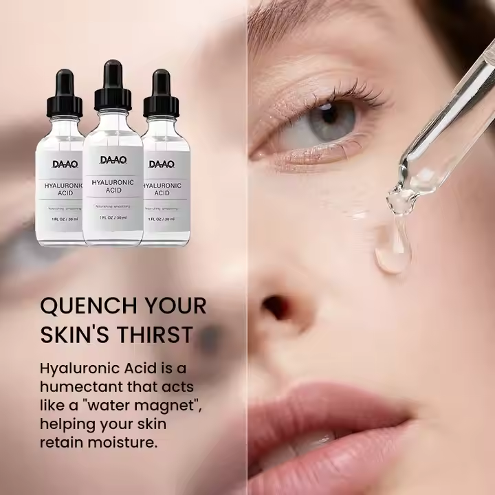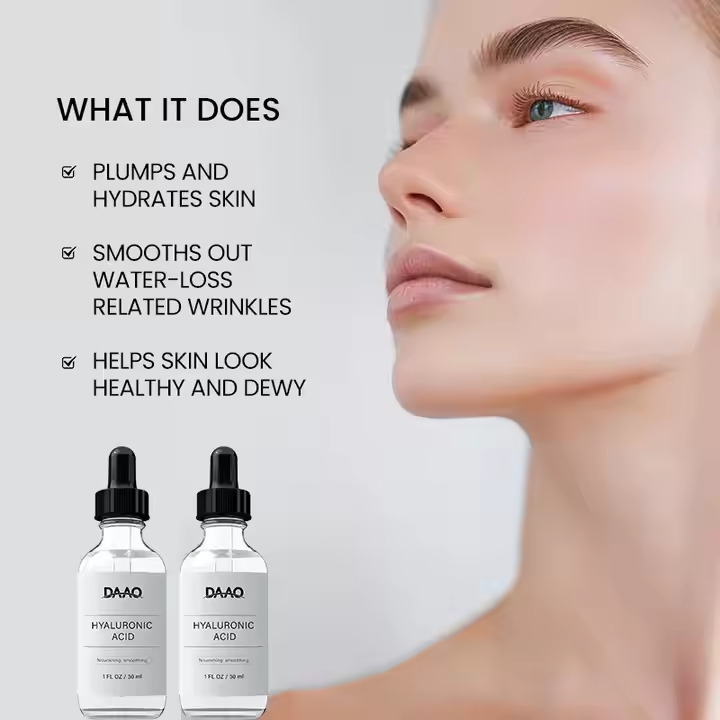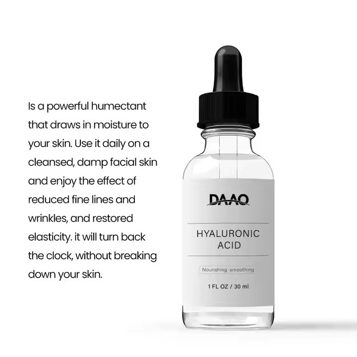 Products Description featureSkin Revitalizer, Moisturizer, Anti-Wrinkle, Anti-Aging, NourishinguseFaceformLotionmain ingredientHyaluronic Acid, Glycerintarget areaFaceShelf Life3 yearPackingBottlegenderFemaleapplicationFor Home UseingredientHyaluronic Acid, Sulfate-Free, Cruelty-Free, Organic, Otherplace of originGuangdong, Chinabrand nameDAAOProduct NameHyaluronic Acid Face SerumFunction 1Deep HydrateFunction 2Moisurizing SkinEffectBrightening WhiteningWhat can be solvedRough FaceAdvantage16 Years ExperiencesKeywordSkincare SerumLogoCustomized Private LogoOEM/ODMAcceptableCertificationISO 22716,GMPCPackaging and deliverySelling UnitsSingle itemSingle package size10.6X3.6X3.5 cmSingle gross weight0.130 kg
