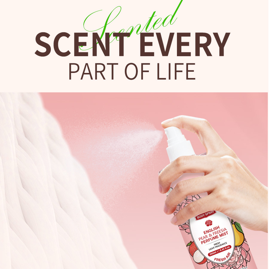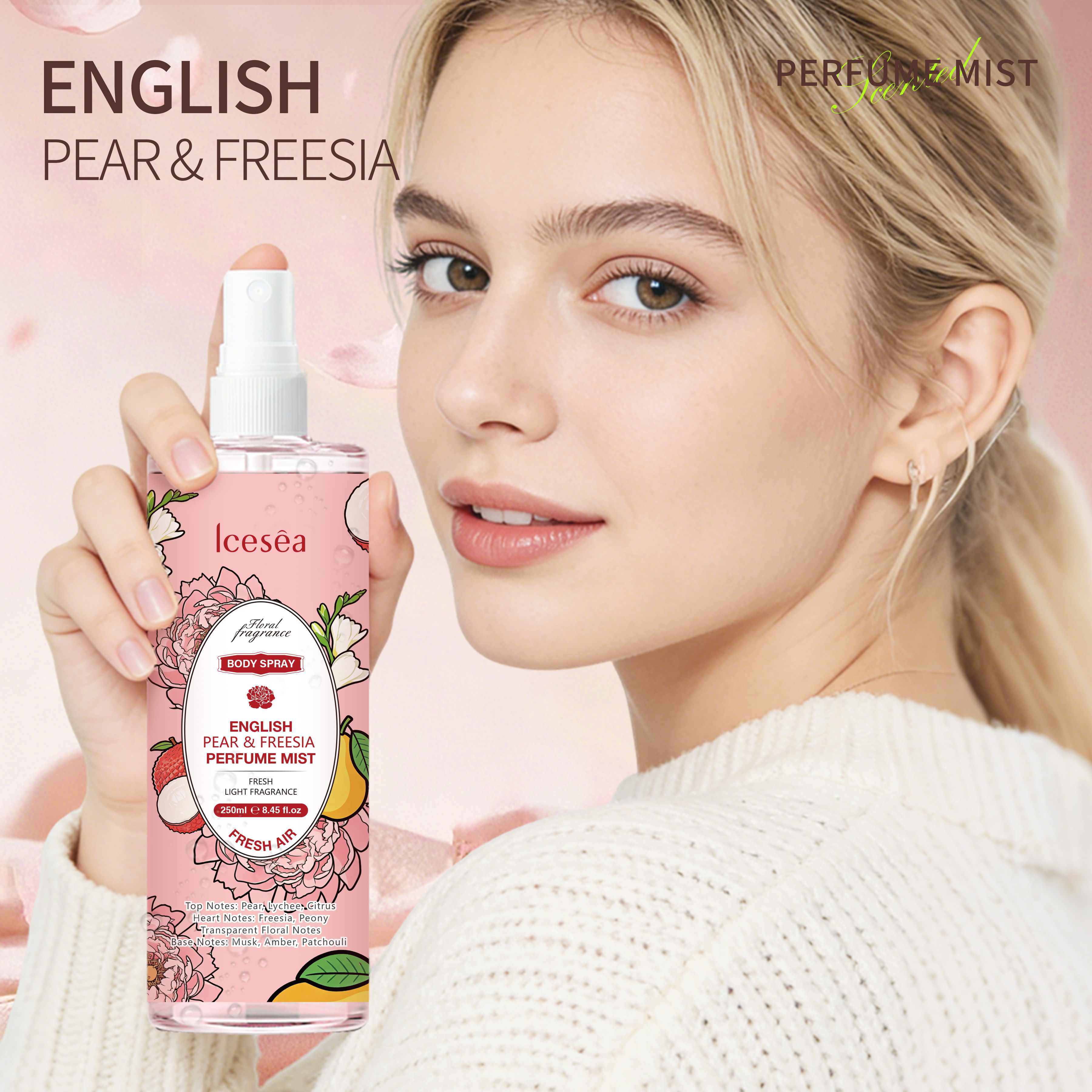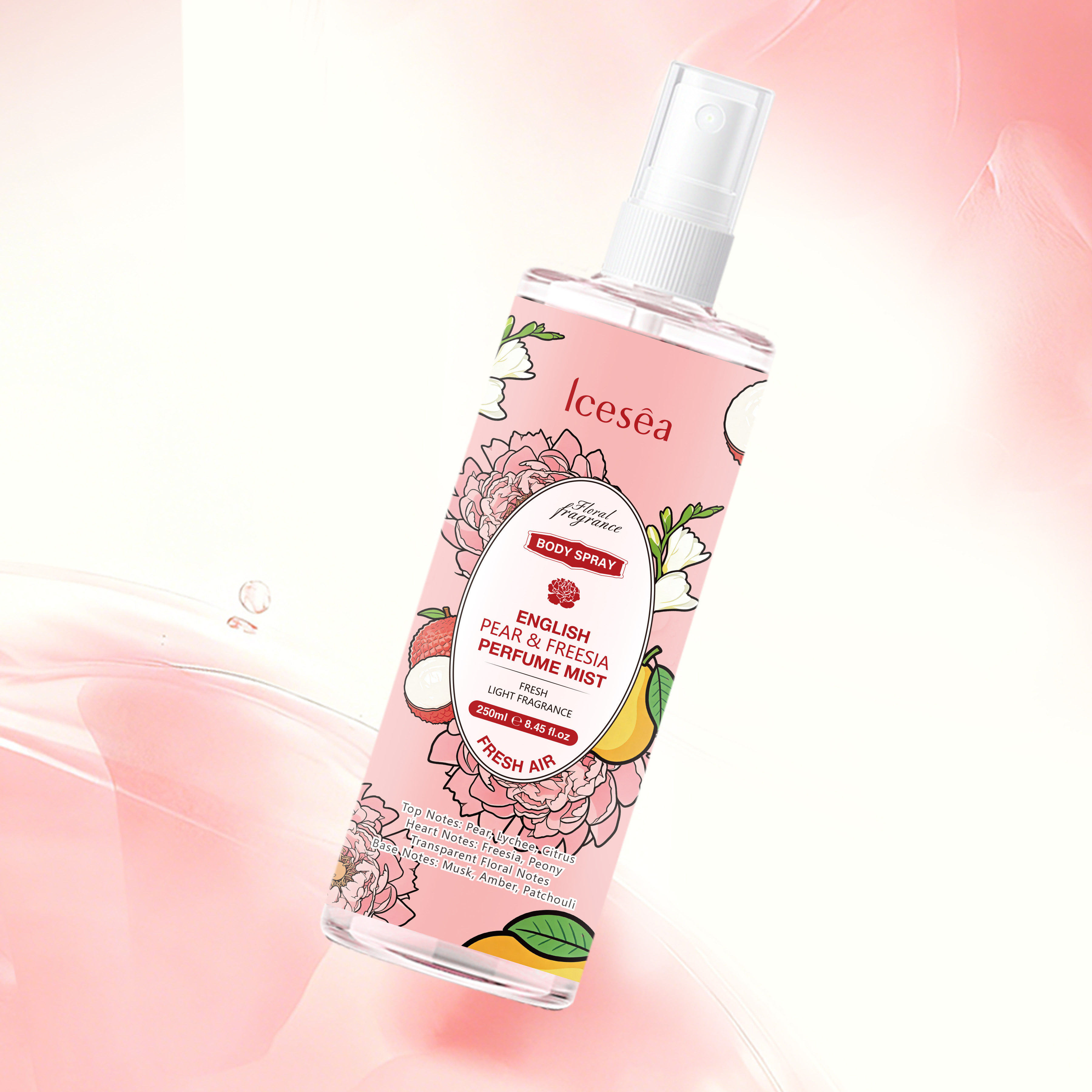 Products Description Key attributesformSpraySmellTop Notes: Pearn Lychee,.citrus Heart Notes: FreegenderFemaleage groupAdultsingredientPEAR FREESIA MUSK LYCHEE PEONY AMBER CITRUSfeatureeliminate odor, long-lasting fragranceApplicationBodyBrandICESEAplace of originGuangdong, ChinaPackaging and deliverySelling UnitsSingle itemPackage size per batch6X6X16 cmGross weight per batch0.320 kg