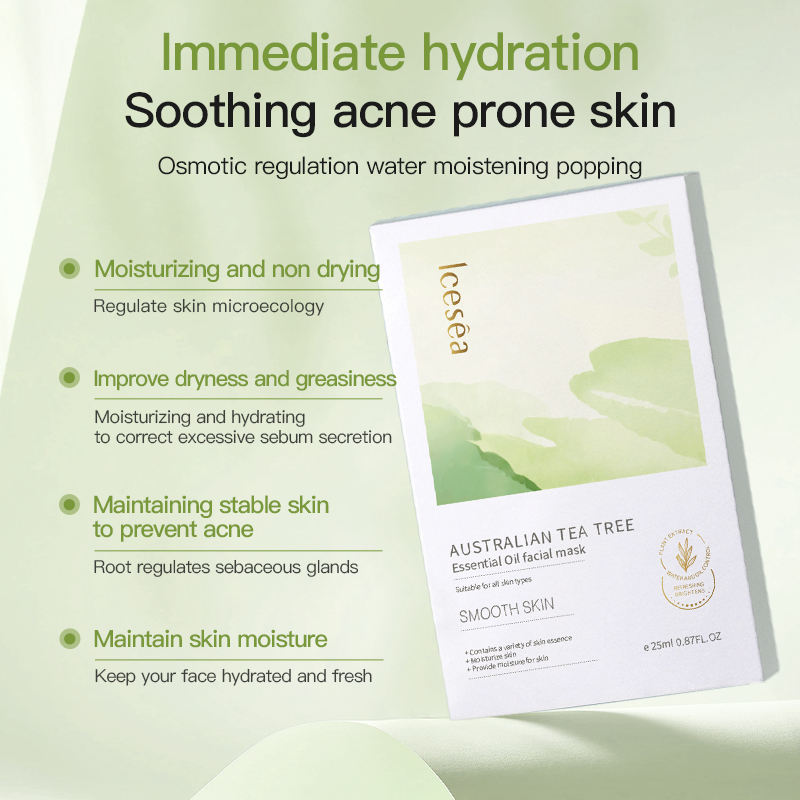 Products Description useFaceskin typeNormalTypefacemaskmask formSheetfeatureMoisturizermain ingredienttea treeingredientHerbalapplicationFor Home UseFragrancetea treegenderFemaleplace of originGuangdong, Chinabrand nameIceseaProduct NameFacial Sheet MaskBrandIceseaFunctionAcne TreatmentTypeFace Care ProductUsage15-20MinutesShelf Life3 YearsServiceOEM OBM ODMPackaging and deliverySelling UnitsSingle itemSingle package size19X14X2.5 cmSingle gross weight0.250 kg